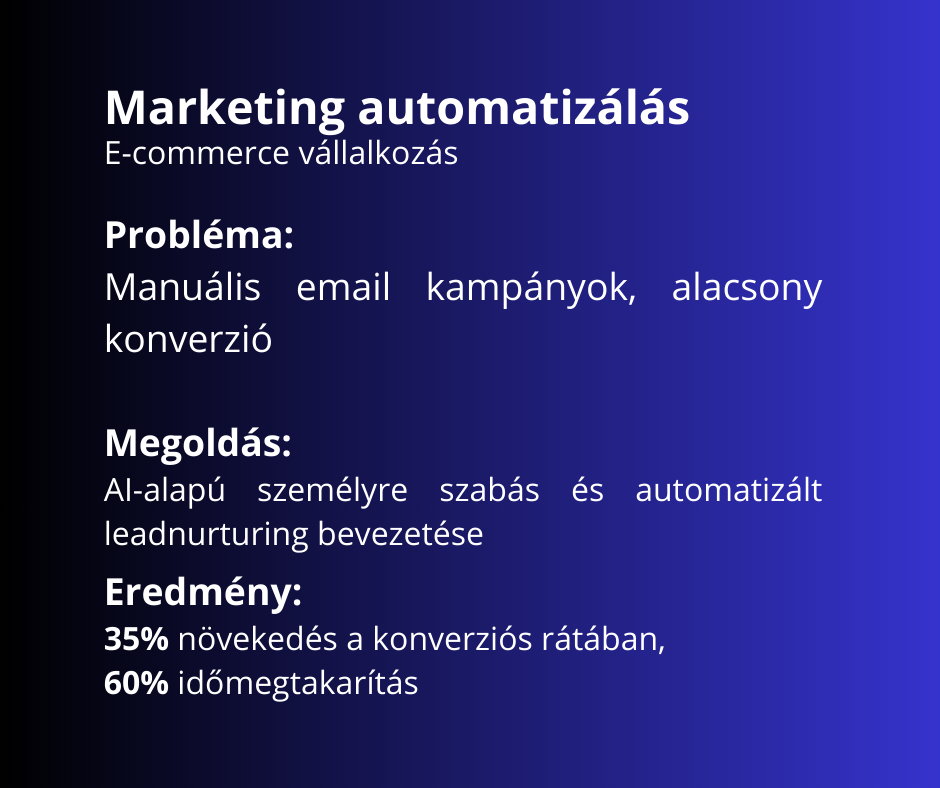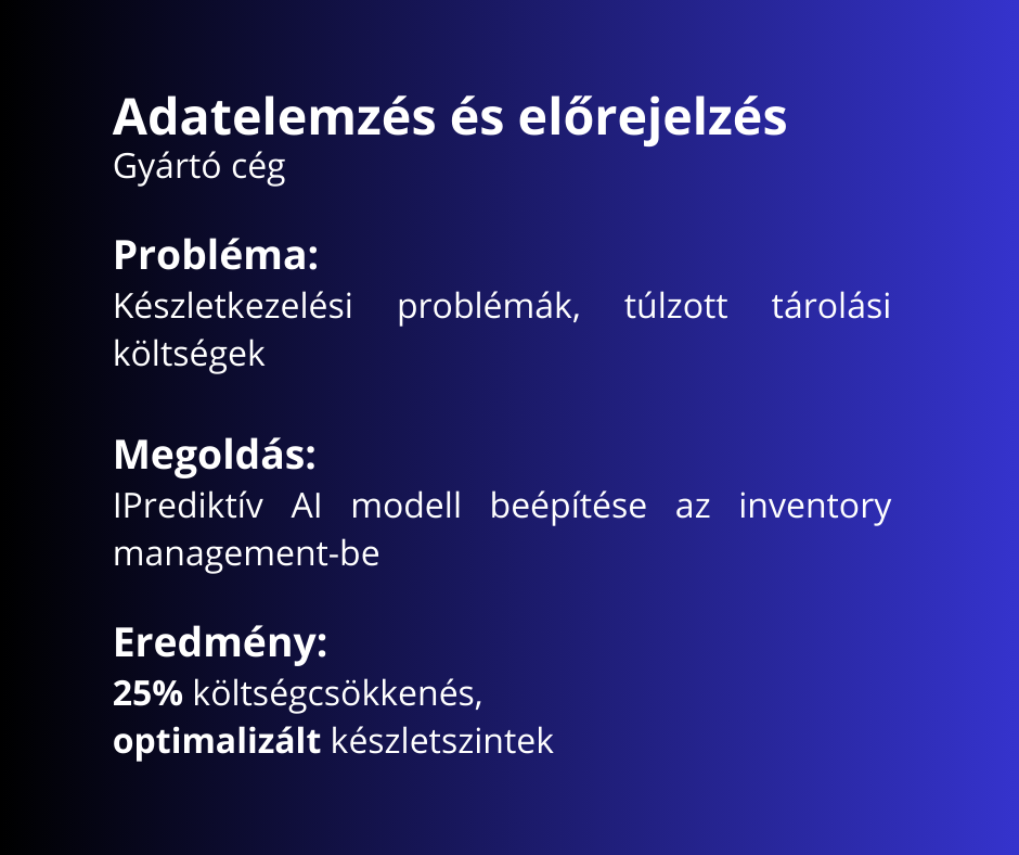 Az AI képes elemezni és optimalizálni az üzleti folyamatokat, azonosítva a szűk keresztmetszeteket és hatékonysági hiányosságokat. Automatizálhatja az ismétlődő feladatokat, mint számlázás, készletkezelés vagy adatfeldolgozás. Ez felszabadítja a csapatot a stratégiai, nagyobb értékű feladatokra összpontosításra, miközben csökkenti a hibák számát és a működési költségeket.