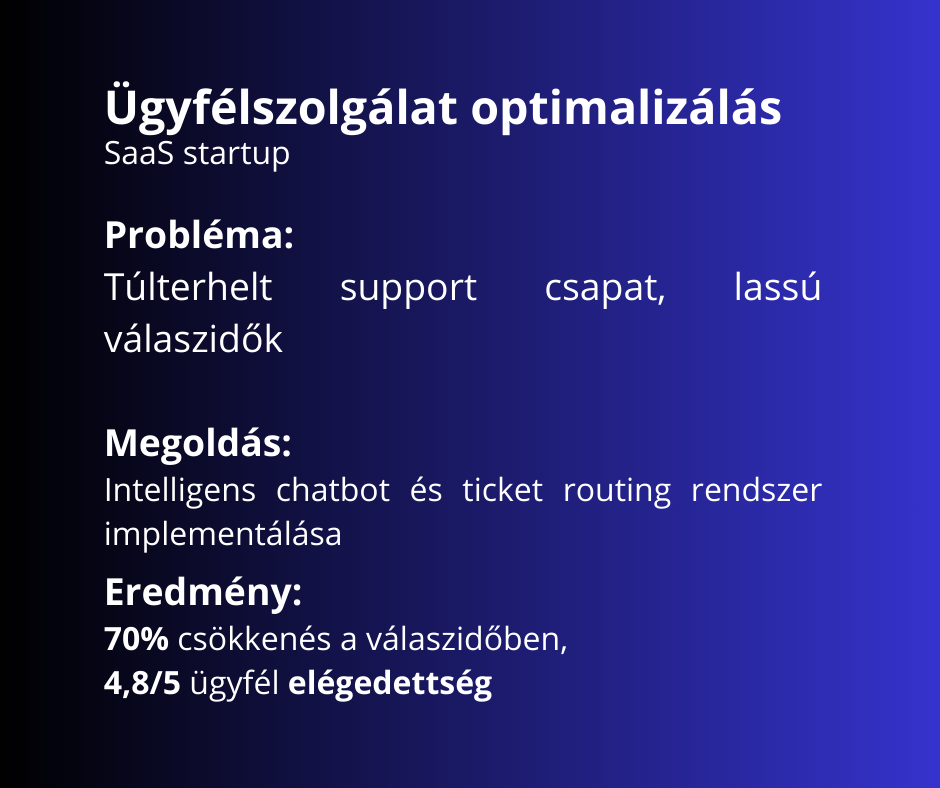 Az AI-alapú chatbotok 24/7 elérhetőséget biztosítanak, azonnal válaszolnak a gyakori kérdésekre, és csak a komplex ügyeket továbbítják emberi ügyintézőknek. Ez akár 70%-os költségmegtakarítást és jelentősen javított ügyfél-elégedettséget eredményezhet. A modern AI rendszerek természetes nyelvet értenek, és személyre szabott válaszokat adnak.